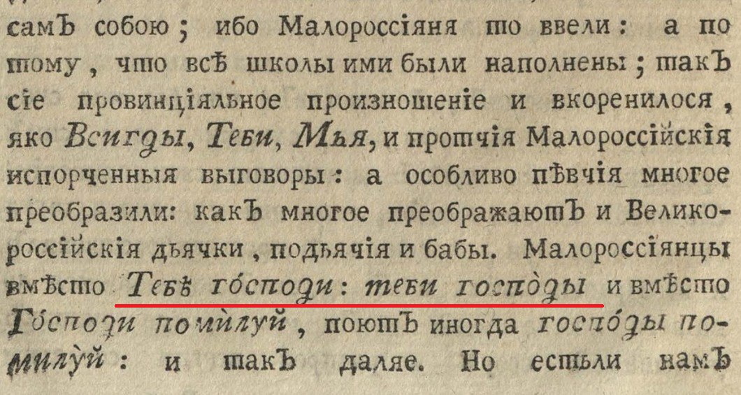 б) О. Сумароков засвiдчує, що українцi «всегда ѣ как i произносят». «Малороссиянцы вместо „Тебе, Господи“ — „Теби, Господы“… поют», тобто вимовляють