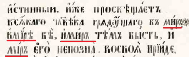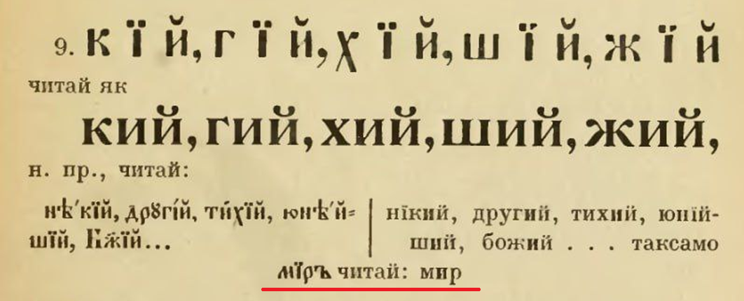 б) Граматика української мови, Василь Сімович, 1919р., розділ "Як читати церковні книги", с. 91: "мїръ читай: мир".