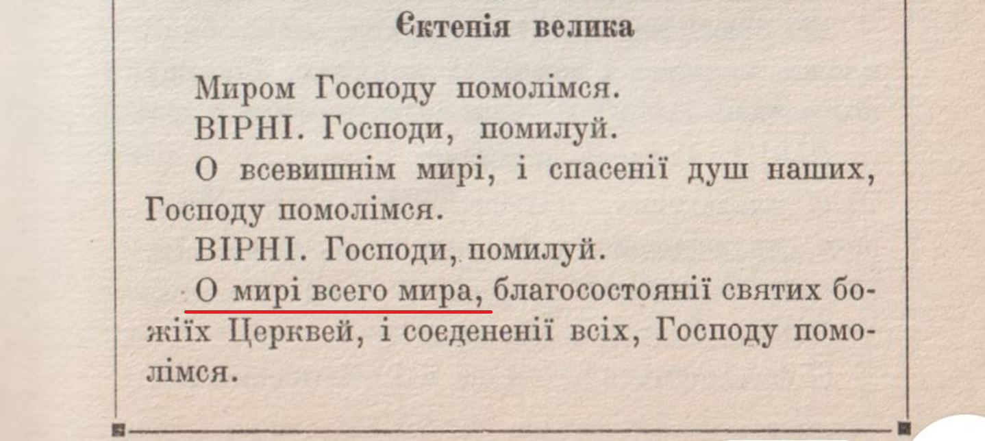 в) Молитвеник, Бухарест, 1976р., виданий Румунською ПЦ, розділ "Свята Літургія Івана Золотоустого": "О мирі всего мира...".
