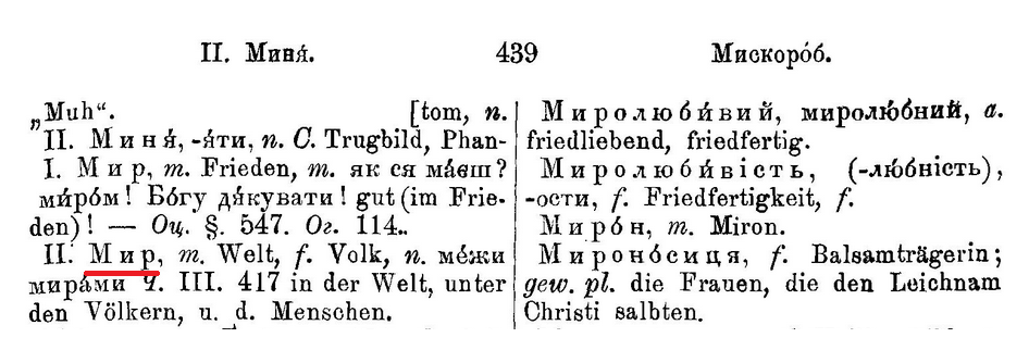 є) церковнослов'янське слово мир у значенні світу увійшло і в українську мову. Такі слова як мирський, миряни пишуться через и. Малорусько-німецький словник (Желехівський Є.І.; Недільський С., 1886р.), який досить чутливий до відтінків вимови (див. "желехівка"), теж подає це слово церез и: мир.