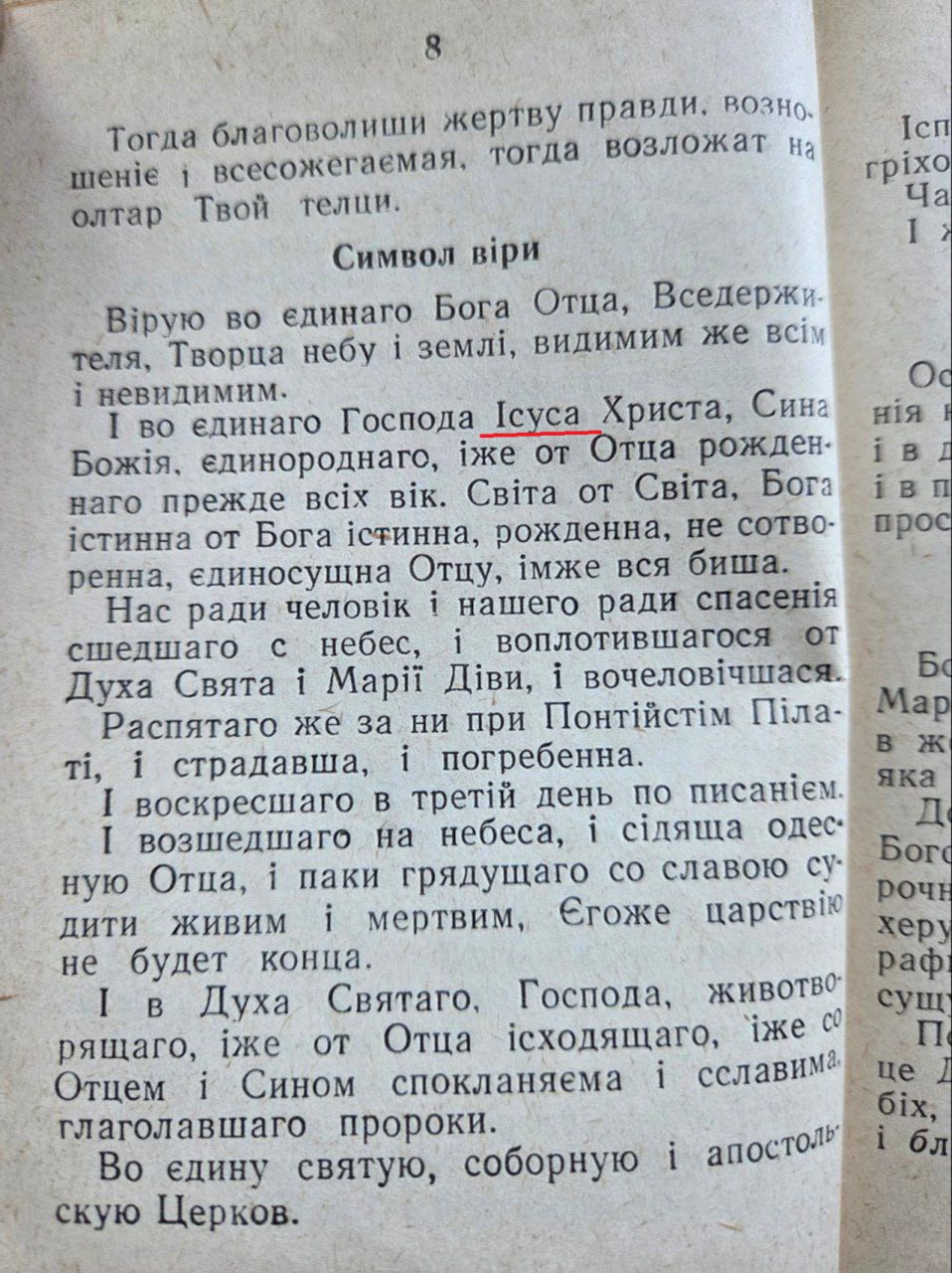 «Viruju vo jedinaho Boha Otca, Vsederžiteľa, Tvorca nebu i zemli, vidimym že vsim i nevidimym. I vo jedinaho Hospoda Iisusa Christa, Syna Božija, jedinorodnaho, iže ot Otca roždennaho prežde vsich vik: Svita ot Svita, Boha istinna ot Boha istinna, roždenna, ne sotvorenna, jedinosuščna Otcu, imže vsja Byša. Nas radi čelovik i našeho radi spasenija, sšedšaho s nebes, i voplotivšahosja ot Ducha Svjata i Mariji Divy, i vočelovičšasja… »