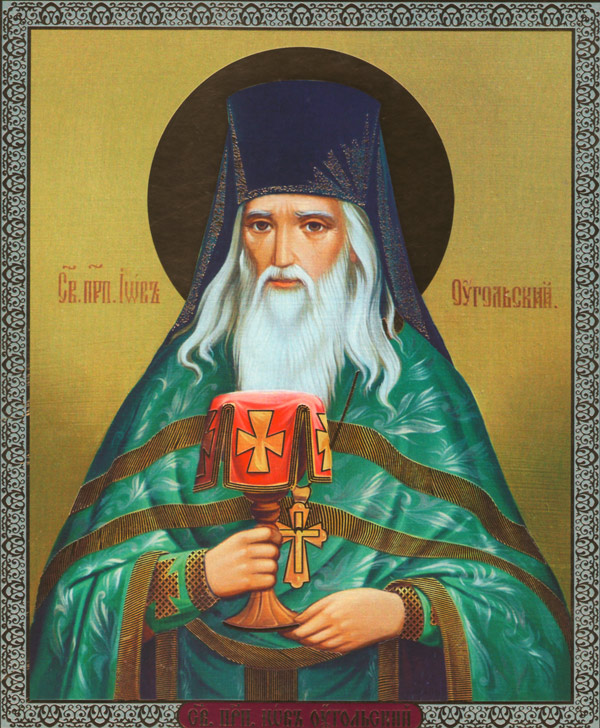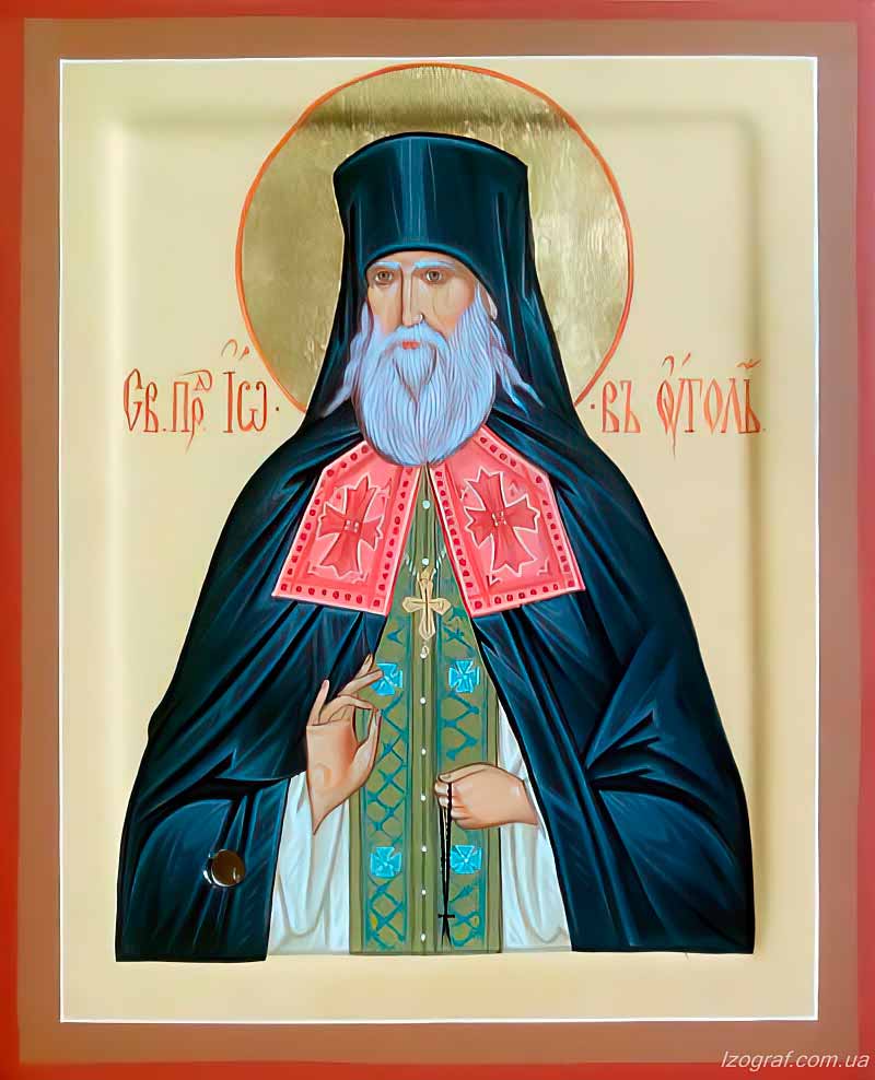 Преподо́бне о́тче І́ове пресла́вне, / ти весь пла́менем а́ки свіча́ горі́л єси́ пред Бо́гом. / В неуси́пном бді́нії предстоя́ моля́ся о ми́рі / і ни́ні лику́єши в черто́зі небе́снім, / помина́й нас, чад твої́х, / притека́ющих і вопію́щих тебі́: / гріхо́в разріше́ніє іспроси́ нам пода́ти // і душа́м на́шим ве́лія ми́лості.